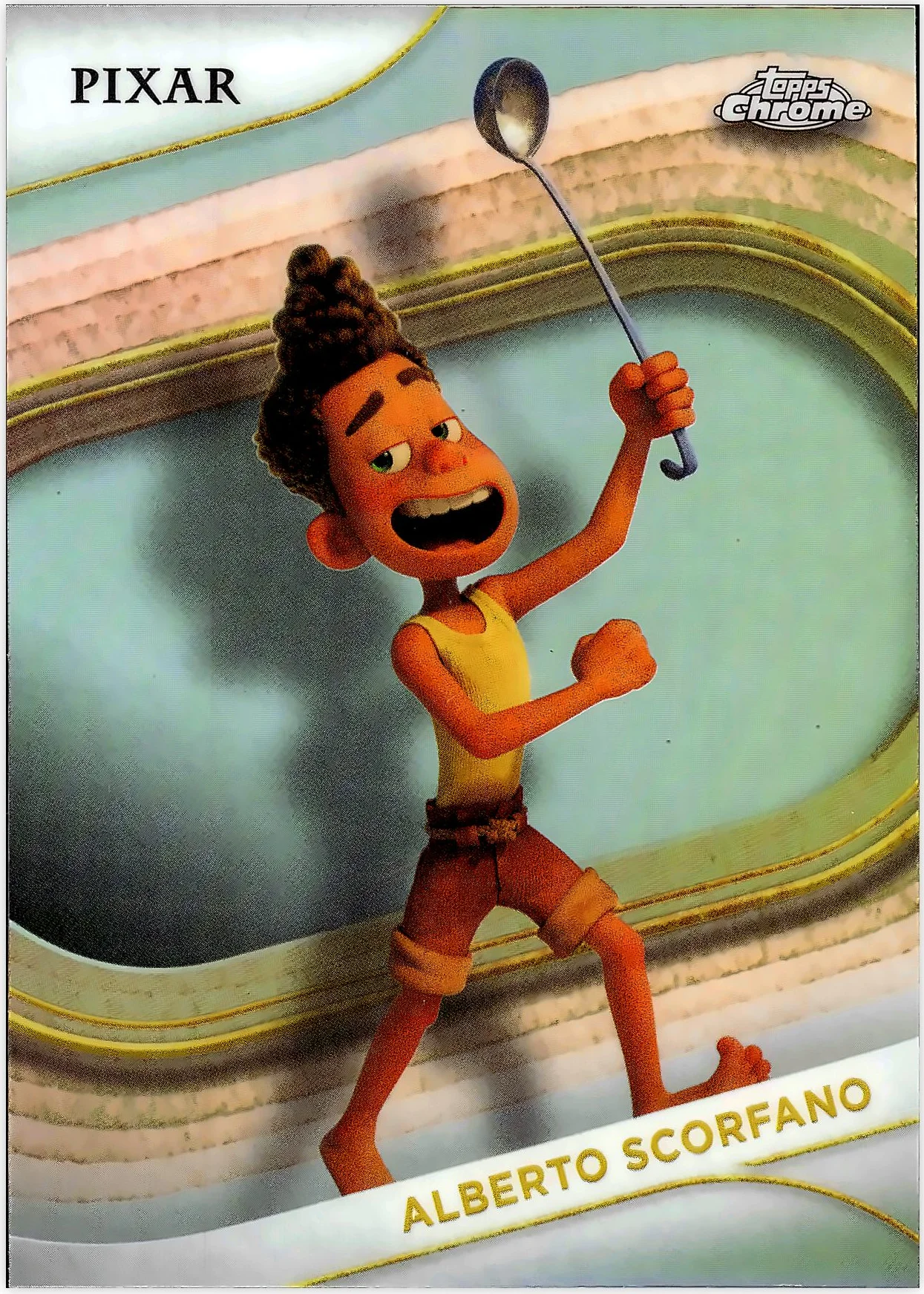 Card #182 from the 2025 Topps Chrome Disney set features Alberto Scorfano in Refractor form. Disney and Pixar character cards have developed a dedicated following among both trading card enthusiasts and film fans. As part of the Refractor subset, this card displays the distinctive chrome finish that sets it apart from standard base versions. The reflective nature of refractor and foil cards makes them visually striking, and collectors often seek out these premium parallels for their display appeal. When evaluating copies, collectors typically assess centering, surface quality, and edge condition, which can be particularly important on chrome finishes due to their reflective properties. Related cards from this set and current market pricing are available for comparison.
