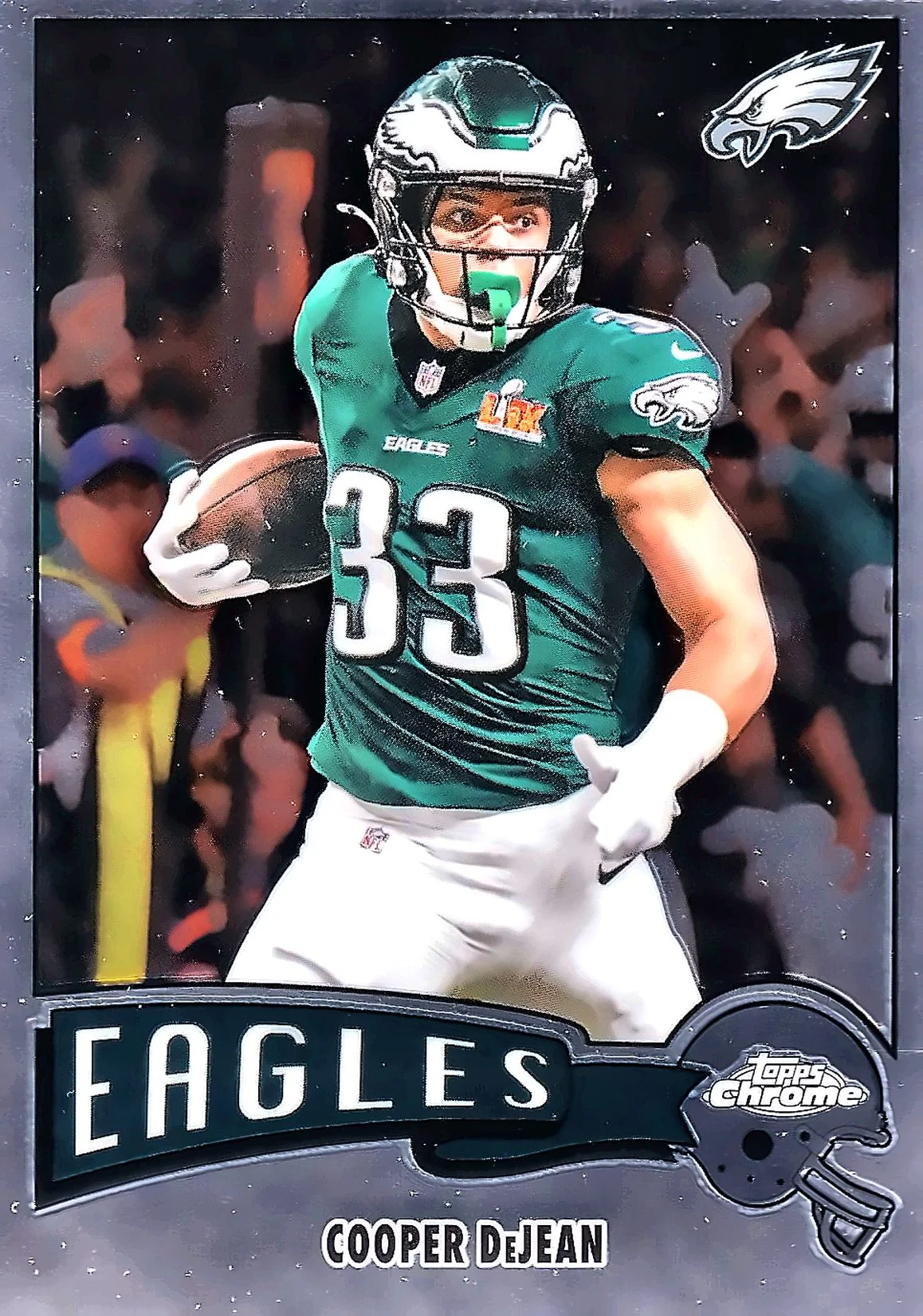 The 2025 Topps Cooper DeJean is a Philadelphia Eagles base card from the 2025 Topps Chrome #1975-27 set. Cooper DeJean appears here as one of the recognizable names in the checklist, giving team and player collectors a straightforward option from the release. For buyers comparing copies, centering, corners, surface, and print quality are usually the biggest factors. This page shows recent eBay pricing along with related Cooper DeJean cards for collectors tracking the market.
