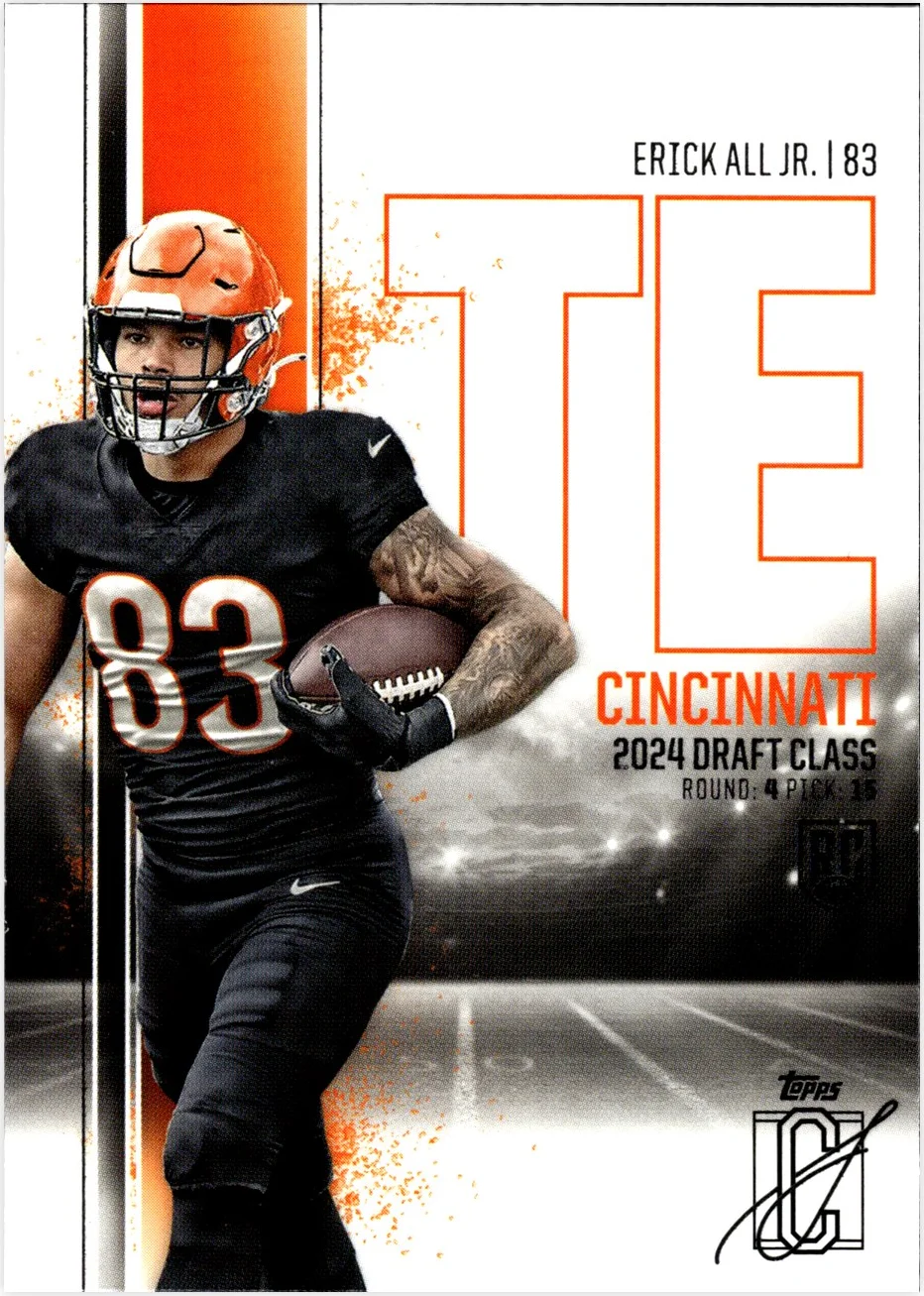 Erick All Jr.'s 2024 Topps Signature Class rookie card captures the Cincinnati Bengals tight end's early career. As a foundational release, this card typically generates collector interest for those pursuing complete player sets or early-year releases. Condition plays an important role when evaluating copies, with collectors examining centering, edge quality, corner sharpness, and surface wear. Building a collection of All Jr. cards from his rookie season provides a starting point for tracking his career across multiple sets and years.