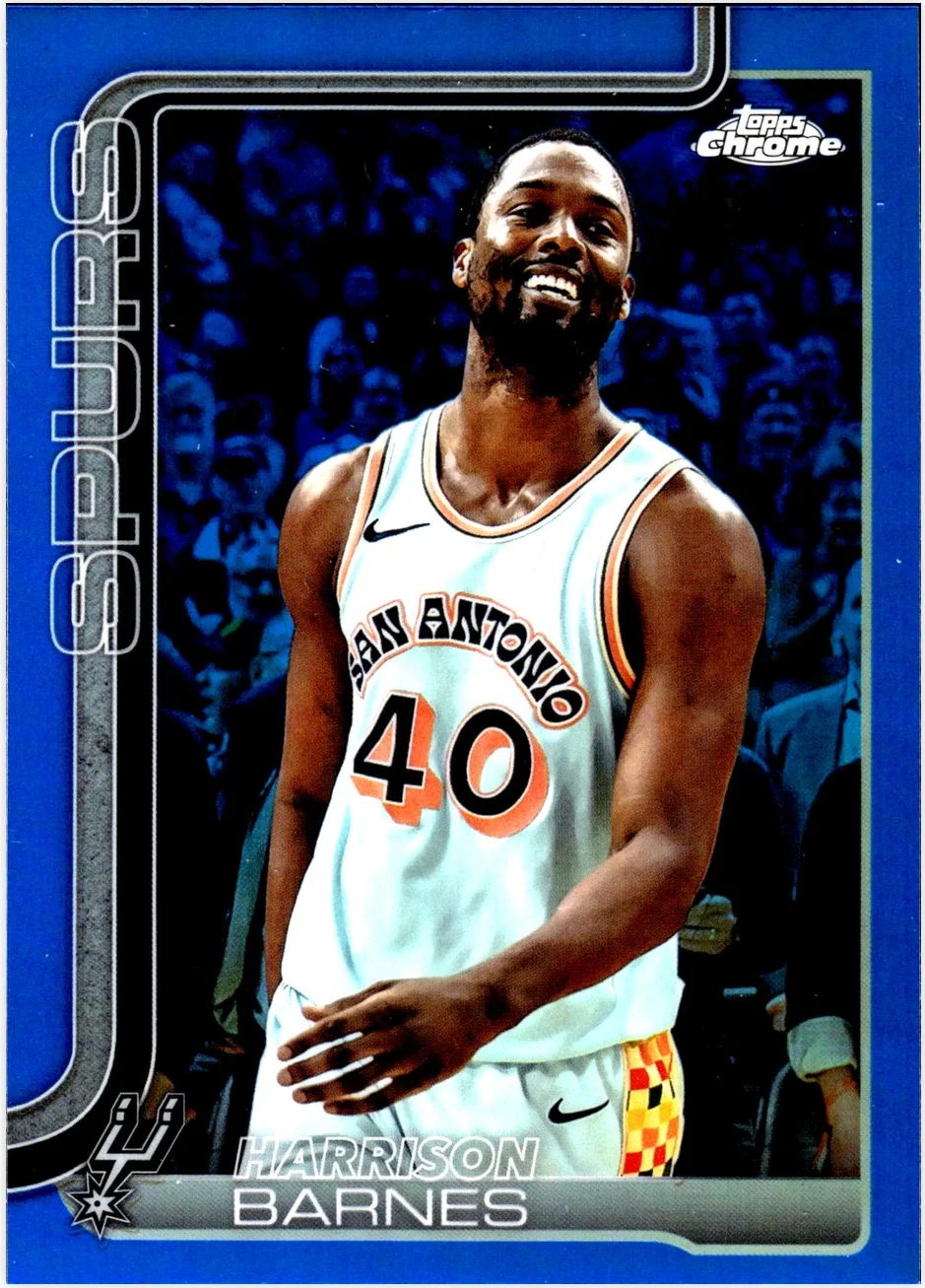 - The Harrison Barnes 2025-26 Topps Chrome #216 Blue Refractor sells for an average of $7.56, ranging from $1.69 to $14.99 based on 13 recent eBay sold listings.