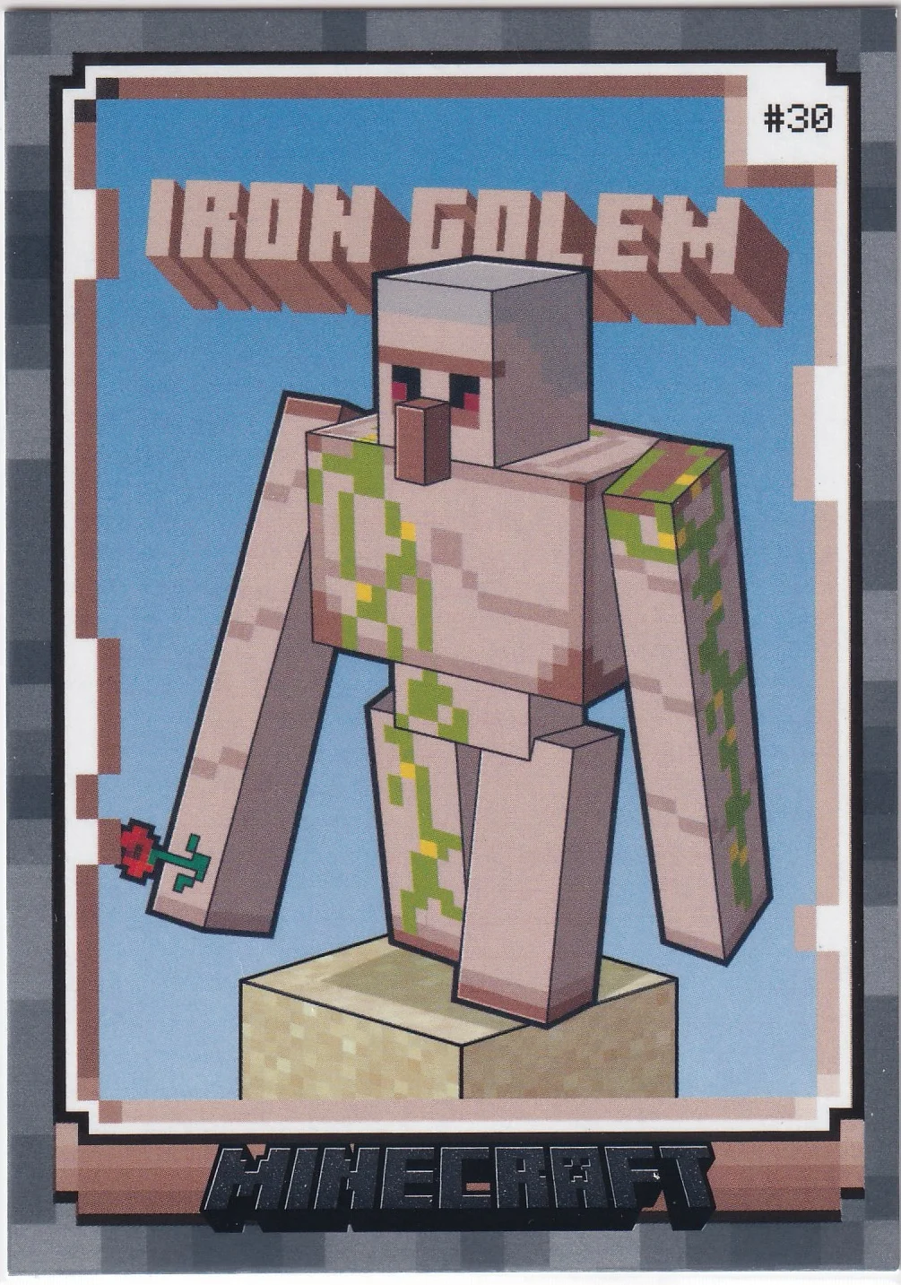 Panini's 2024 Minecraft set brings the Iron Golem character to collectors through card number 30, merging video game imagery with traditional trading card collecting. This Character subset entry appeals to younger collectors, set builders, and Minecraft enthusiasts seeking their favorite mobs, items, and characters in physical form. The card offers visual distinction from standard base checklist releases. Like all trading cards, condition significantly impacts the value of individual copies, with centering, corners, and surface quality serving as the primary evaluation points. Tracking recent market activity and comparing this card to other releases from the Minecraft set provides helpful context for collectors monitoring their collections.