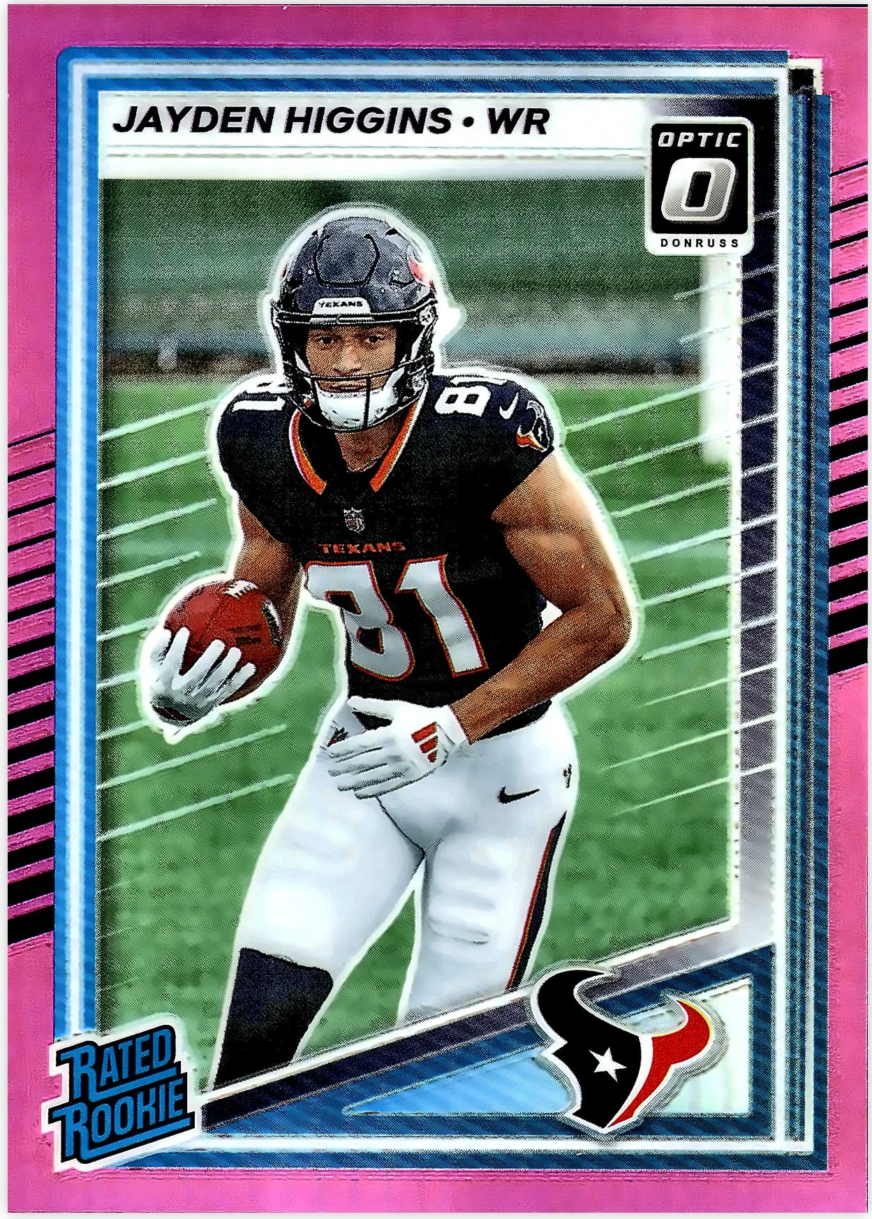 - Yes, the Jayden Higgins Rookie Card 2025 Donruss #334 Optic Rated Rookies Preview Pink is a rookie card featuring Jayden Higgins of the Houston Texans.