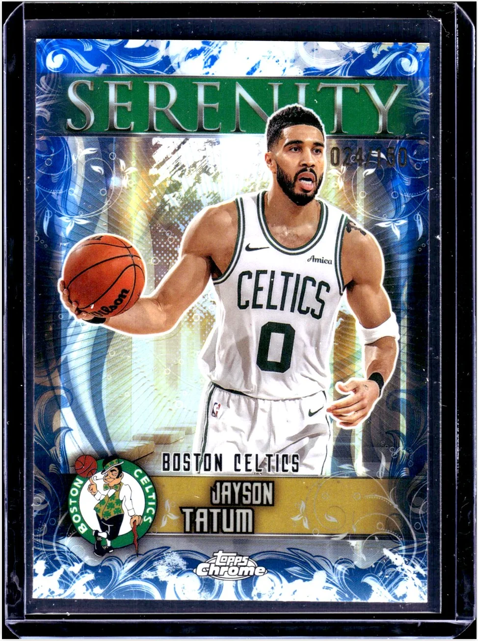 Jayson Tatum's 2025-26 Topps Chrome Serenity Blue Refractor (SY-7) offers a distinct parallel to the standard base card. The refractor treatment and limited print run make it a notable variation for collectors seeking scarcer versions of their favorite player. Serial numbered to 150, this copy provides tangible scarcity compared to unnumbered base releases. When evaluating cards like this, collectors typically assess factors such as serial number placement, surface quality, centering, and overall eye appeal across available listings. The Serenity Blue parallel remains a solid addition for those building complete Tatum collections or targeting specific Topps Chrome parallels from the 2025-26 set.