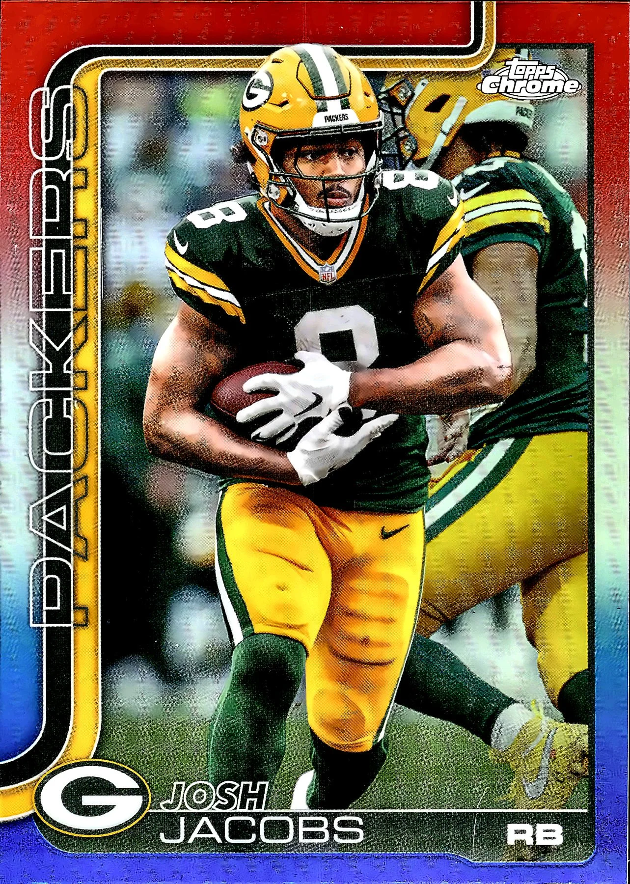 - The Josh Jacobs Red White Blue Refractor 2025 Topps Chrome #110 sells for an average of $7.35, ranging from $3.95 to $29.99 based on 19 recent eBay sold listings.