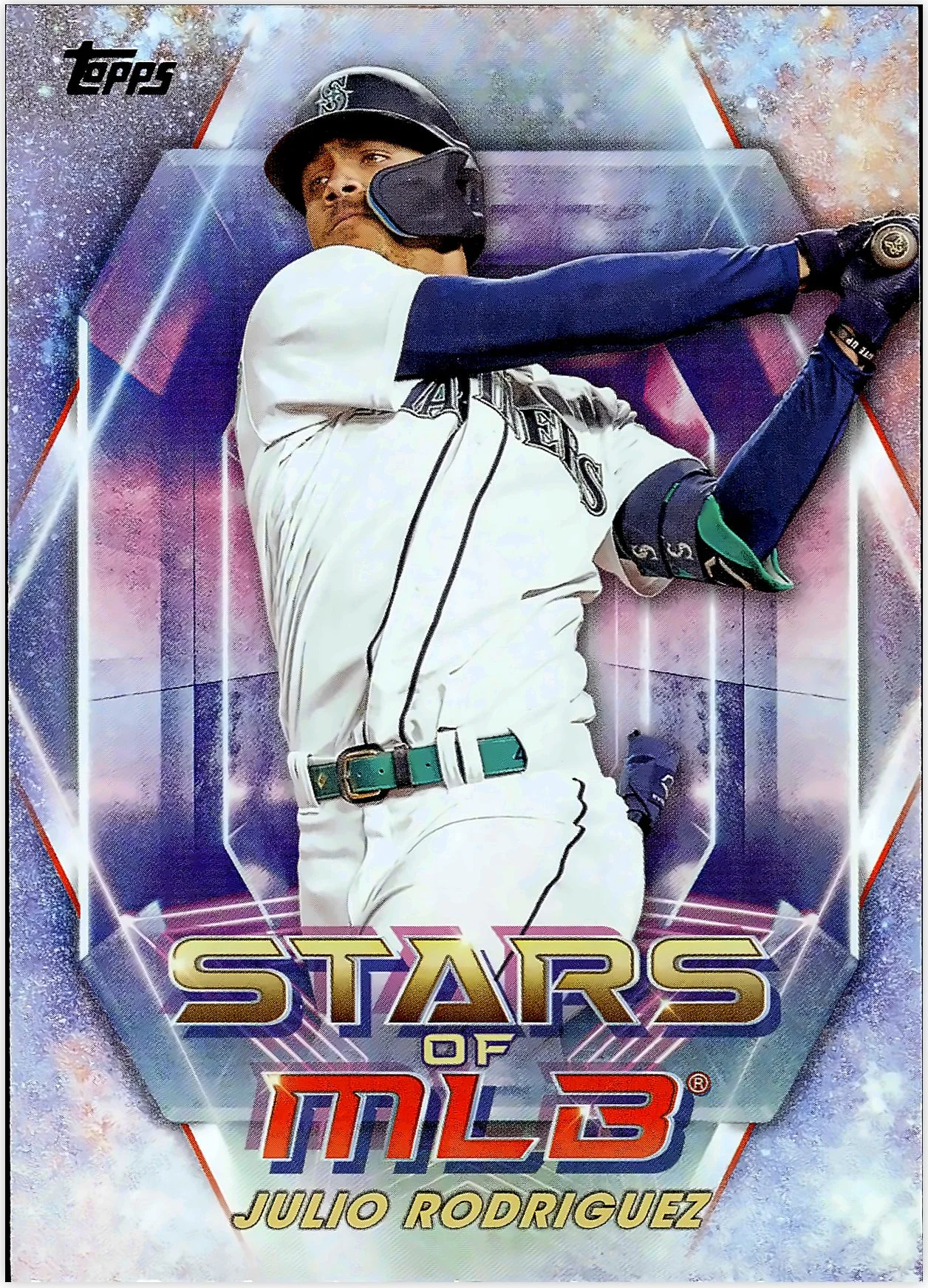 The 2023 Topps Julio Rodriguez is an insert card from the Stars of MLB, giving collectors a different design and chase profile than the standard base release. Insert cards often appeal to player collectors who want more variety, as well as set builders targeting specific themed subsets. Buyers usually compare condition, centering, and visual presentation closely, especially on modern glossy or foil-heavy designs. This page includes recent eBay market data and links to related Julio Rodriguez inserts and base cards.