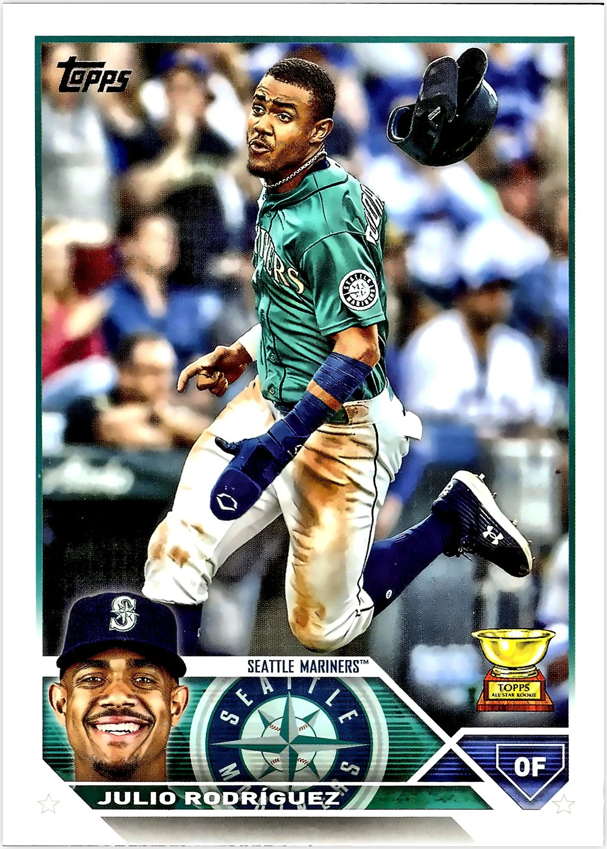 The 2023 Topps Julio Rodriguez is a Seattle Mariners base card from the 2023 Topps Stars of the American League #AL-14 set. Julio Rodriguez appears here as one of the recognizable names in the checklist, giving team and player collectors a straightforward option from the release. For buyers comparing copies, centering, corners, surface, and print quality are usually the biggest factors. This page shows recent eBay pricing along with related Julio Rodriguez cards for collectors tracking the market.