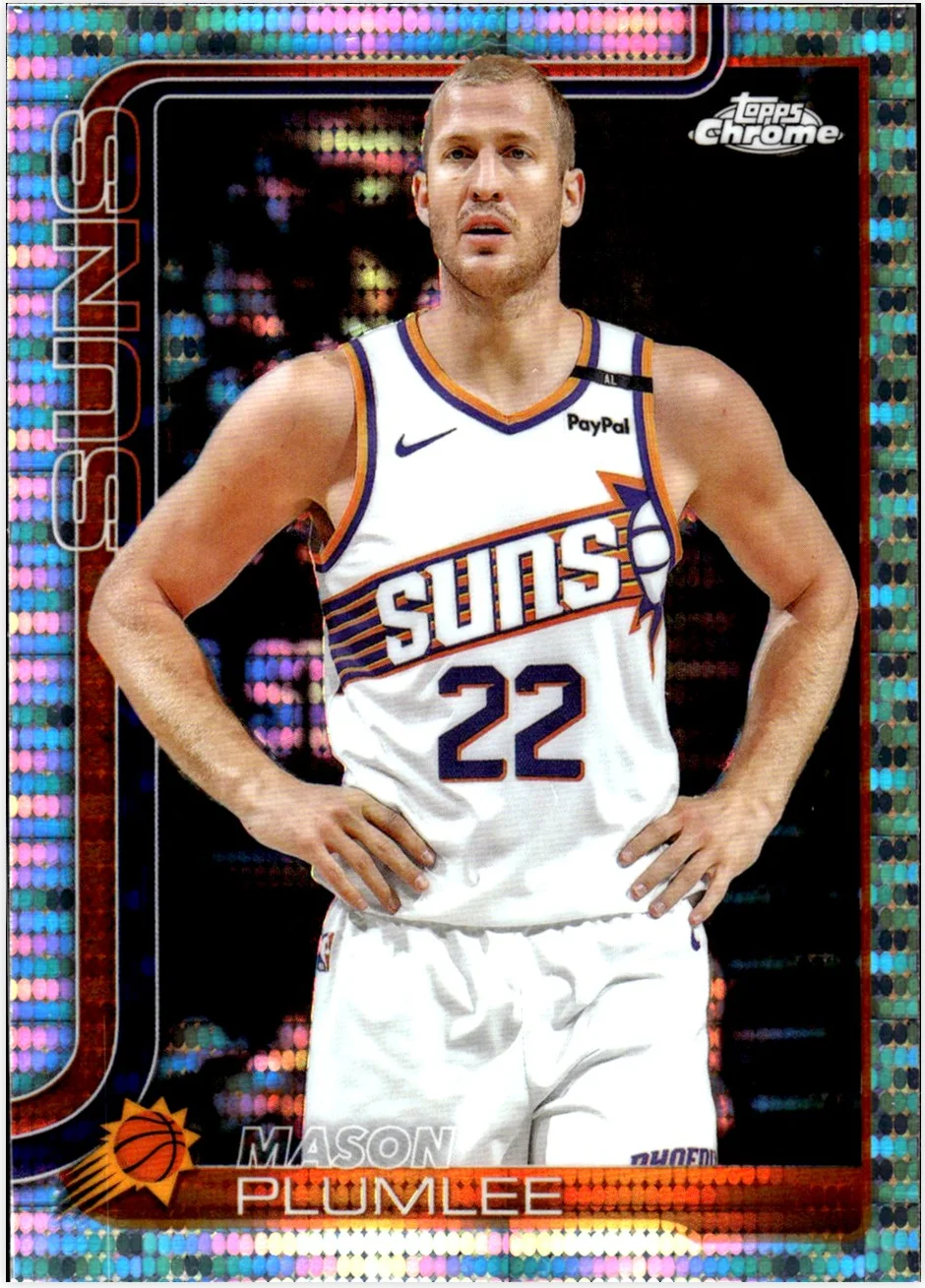 Card number 106 from the 2025-26 Topps Chrome set features Mason Plumlee in a Phoenix Suns uniform on this Pulsar Refractor parallel. The refractor technology creates a distinctive visual effect that differentiates it from the standard base card release. Collectors interested in Plumlee parallels often seek out these alternate versions for their unique appearance and lower availability compared to the base checklist entry. When evaluating Pulsar Refractors, pay attention to surface quality, centering, and overall eye appeal across different listings. This card presents an option for those building a comprehensive Plumlee collection or focusing specifically on Chrome refractor parallels from this release.