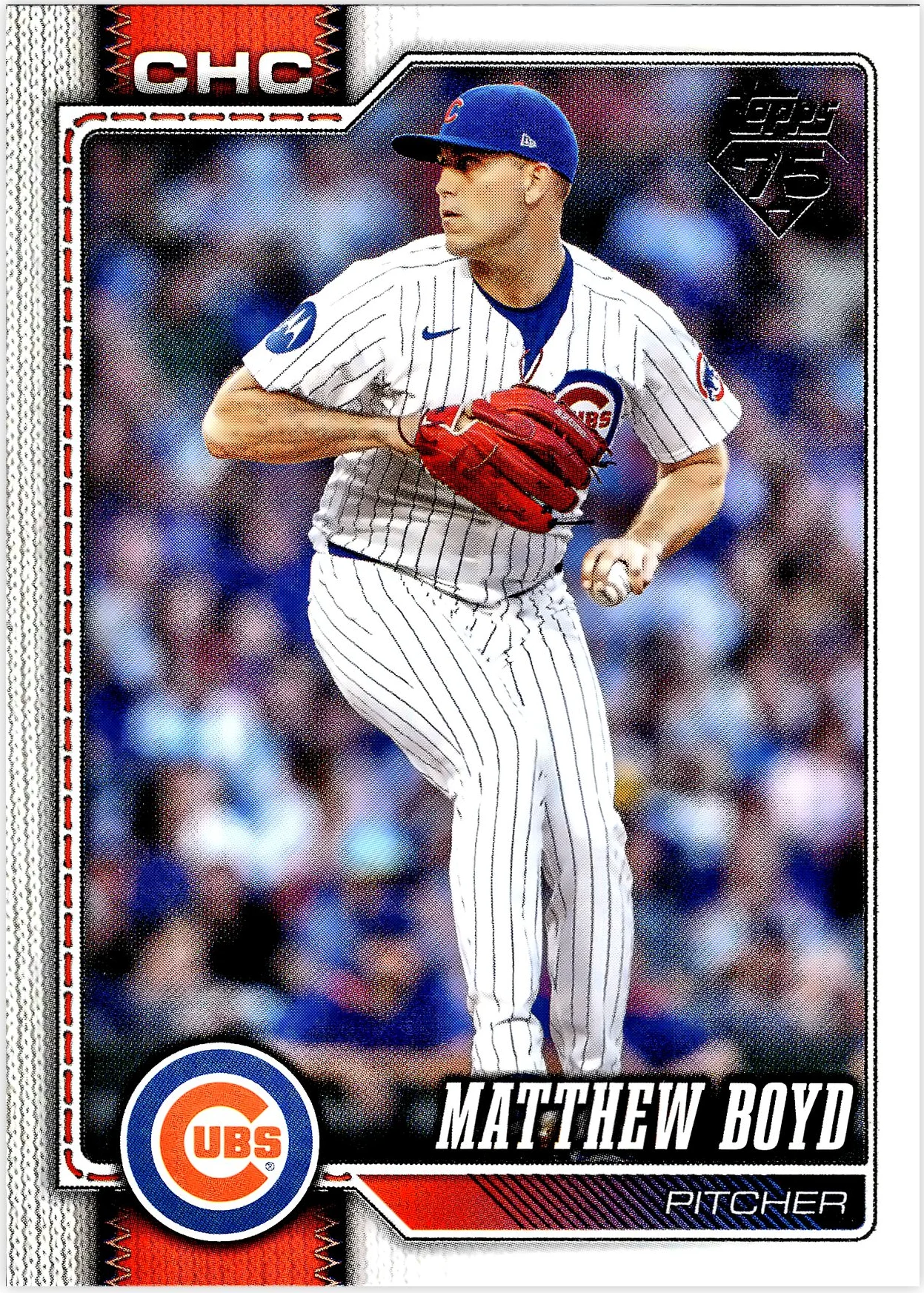 The 2026 Topps Matthew Boyd is a Chicago Cubs base card from the 2026 Topps #51 set. Matthew Boyd appears here as one of the recognizable names in the checklist, giving team and player collectors a straightforward option from the release. For buyers comparing copies, centering, corners, surface, and print quality are usually the biggest factors. This page shows recent eBay pricing along with related Matthew Boyd cards for collectors tracking the market.