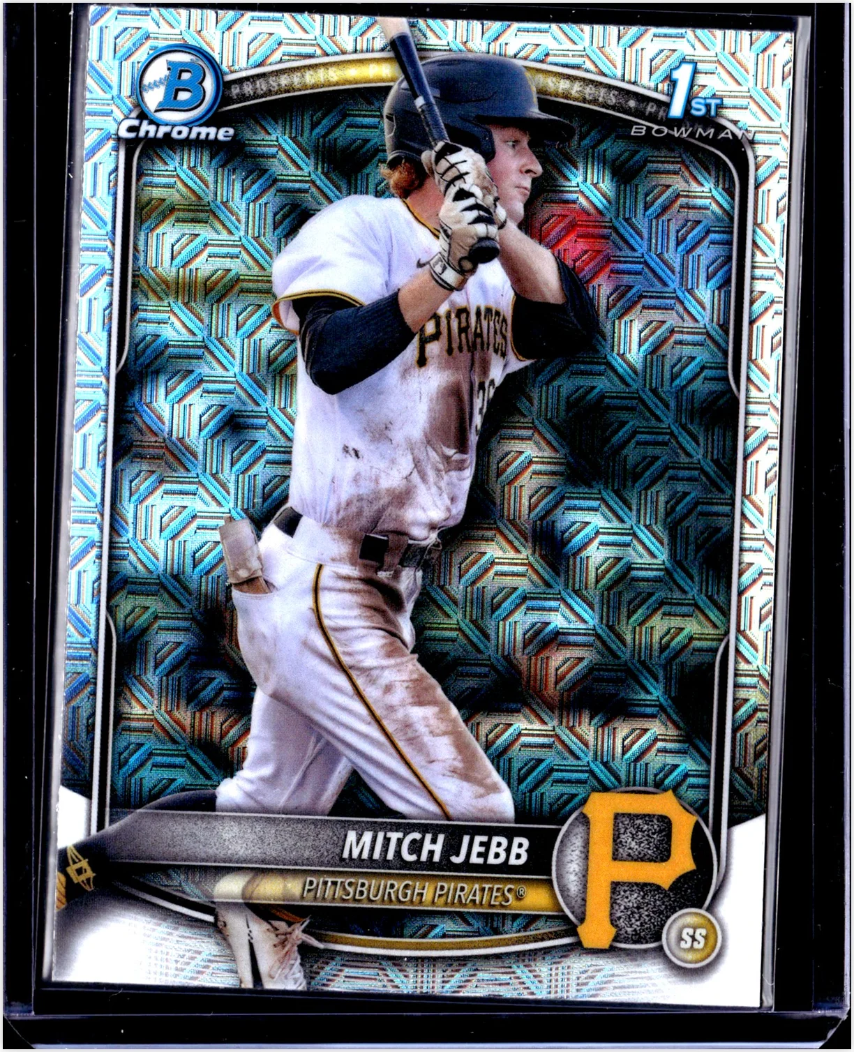 Mitch Jebb's Chrome Prospects Mojo Refractor from 2025 Bowman offers a striking alternative to the standard base card. The refractor finish creates a distinctive visual appeal with its colorful prismatic effect, making it a popular choice among collectors who prefer parallel versions. Card number BCP-41 shares the same player image and Pirates branding as the original release but with enhanced visual character. When evaluating this card, collectors typically examine surface quality, centering, and overall condition. This listing provides current market pricing alongside other Mitch Jebb parallels and related releases for comparison shopping.