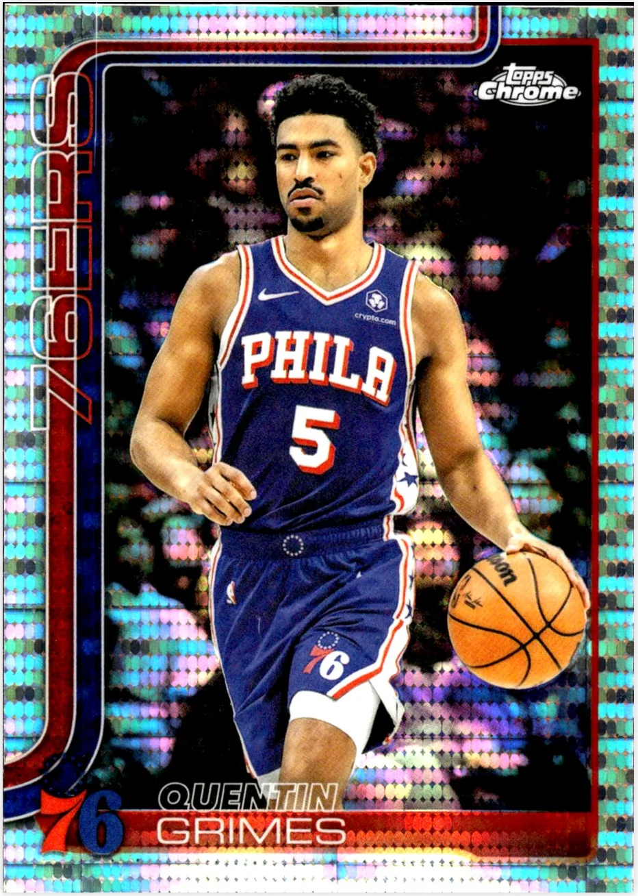 Quentin Grimes appears on card 197 of the 2025-26 Topps Chrome set as part of the Pulsar Refractor parallel series. The refractor finish gives this card its distinctive visual appeal, setting it apart from standard base versions. Collectors interested in Philadelphia 76ers cards often seek out parallel versions like this one to diversify their collections. When evaluating Pulsar Refractors, pay attention to centering, surface condition, and overall eye appeal. This page features current market listings and pricing information for this Grimes card, along with other available parallels and related releases from the same set.