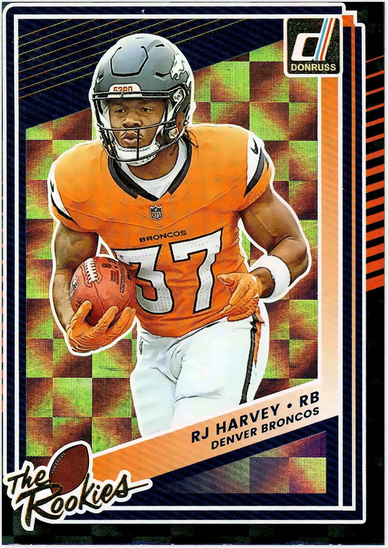 RJ Harvey's appearance in the 2025 Donruss The Rookies subset offers collectors an alternative to the standard base design. These insert cards attract both player enthusiasts seeking variety and set builders focused on thematic subsets. The card's visual presentation, centering, and condition are worth evaluating carefully, particularly given modern Donruss glossy and foil treatments. Card number 32 provides Denver Broncos fans and RJ Harvey collectors with another option to pursue alongside base offerings and other insert releases from the 2025 Donruss product line.
