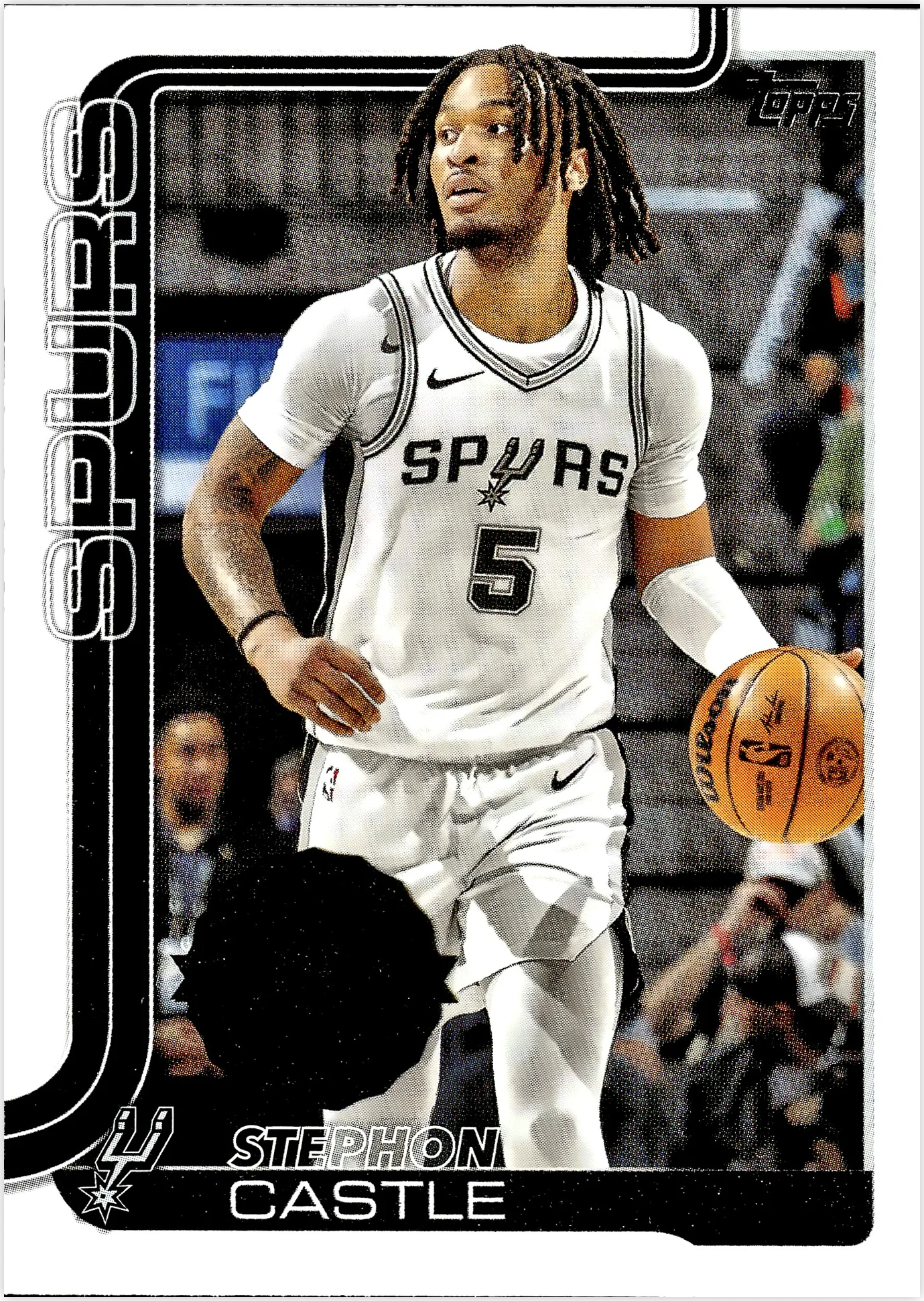 Stephon Castle is featured in the 2025-26 Topps set as card number 197, showcasing the San Antonio Spurs guard in this base release. Castle stands out as a notable inclusion in the checklist, making this a key addition for both team collectors and those building Spurs sets. When evaluating copies of this card, standard grading considerations apply - centering, corner condition, surface quality, and print clarity all play important roles in determining overall presentation. Whether you're filling gaps in your collection or comparing market values, this straightforward base card offers a solid representation from the 2025-26 Topps basketball release.
