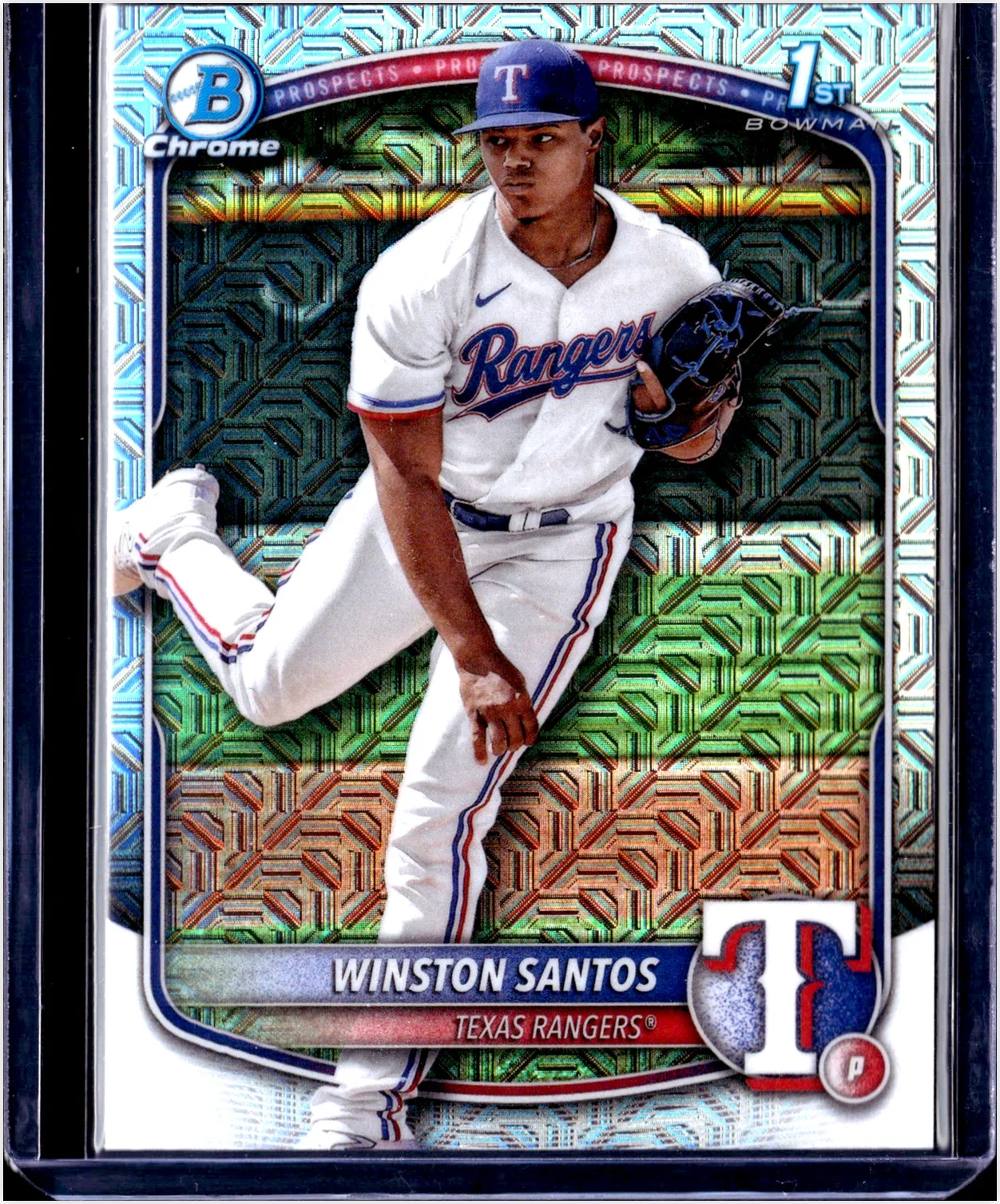 Winston Santos' 2025 Bowman Chrome Prospects Mojo Refractor card (BCP-121) offers a distinctive visual alternative to the standard base version. The refractor parallel features the characteristic light-refracting design that appeals to collectors seeking variety in their Rangers prospects collection. With a lower print run compared to base copies, these parallels attract those looking to build complete player collections or focus on specialty parallels. When evaluating cards like this one, collectors typically assess surface quality, centering, and overall appearance. This page provides current market listings and additional Winston Santos cards from the 2025 Bowman release and other sets.